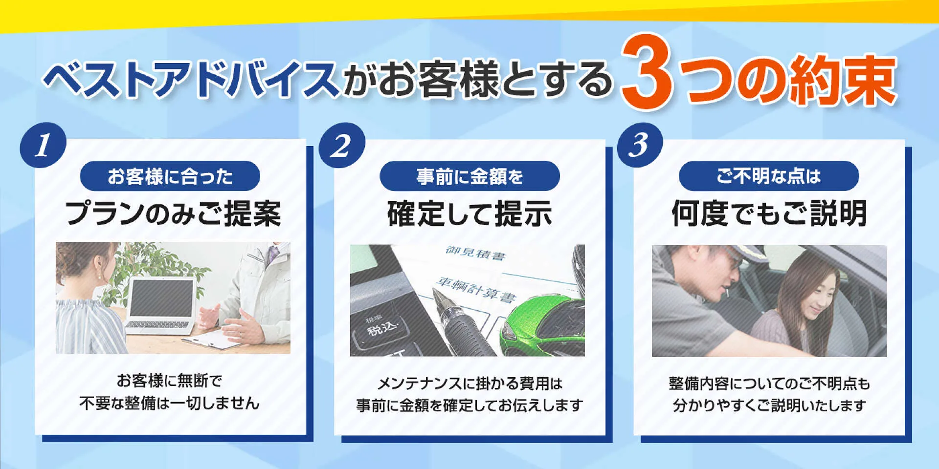「メンテナンス必須箇所」と、「推奨箇所」を切り分けてお伝えします。推奨箇所についてはお客様のご予算などを考慮して、対応するかしないかを相談させていただきます。お客様に無断で不要な部分の整備をすることはいたしませんのでご安心ください。